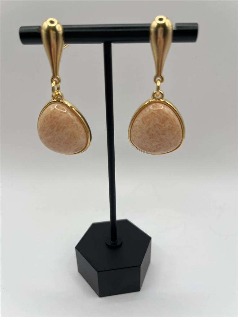 Enjoy the elegance of Beige Amazonite. 2″L x 0.75″W. Dangling Earrings with rounded triangle gemstone in genuine Amazonite.18K gold plated. Nickel free. Post earrings.