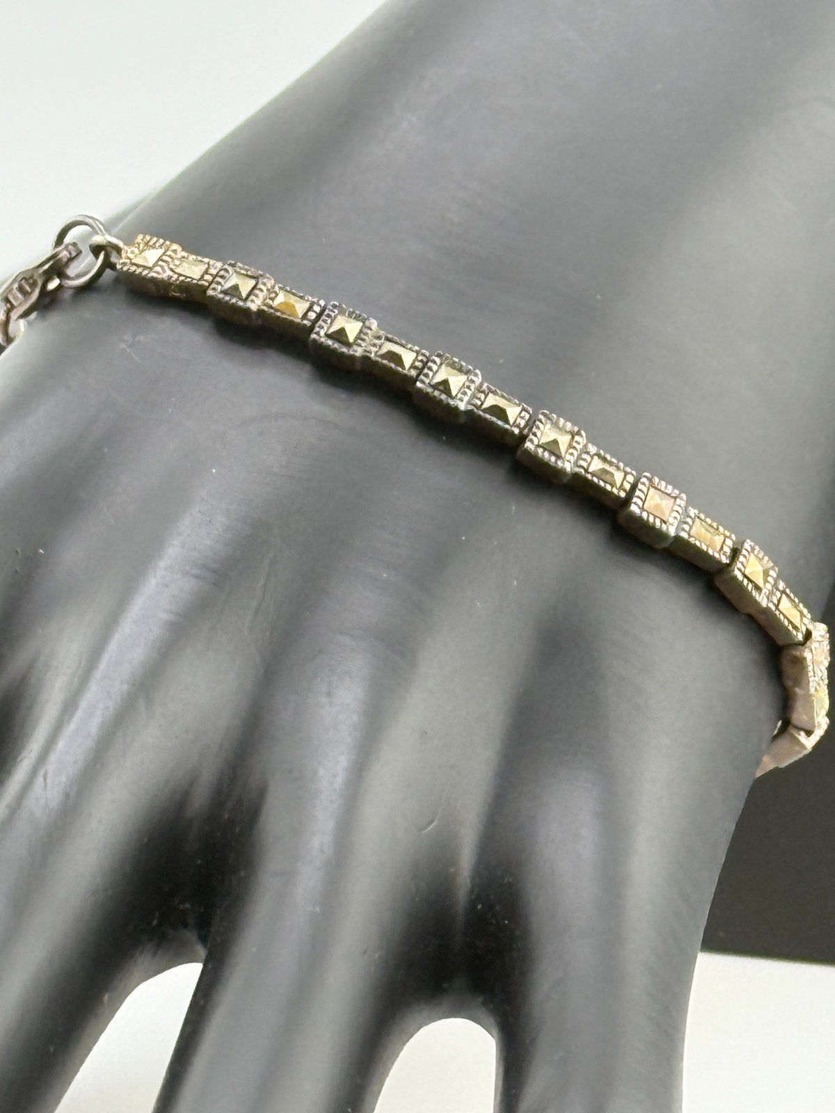 A beautiful sterling silver bracelet with pyramid shaped stones. Measures 7.5 inches. Very pretty and unusual.
