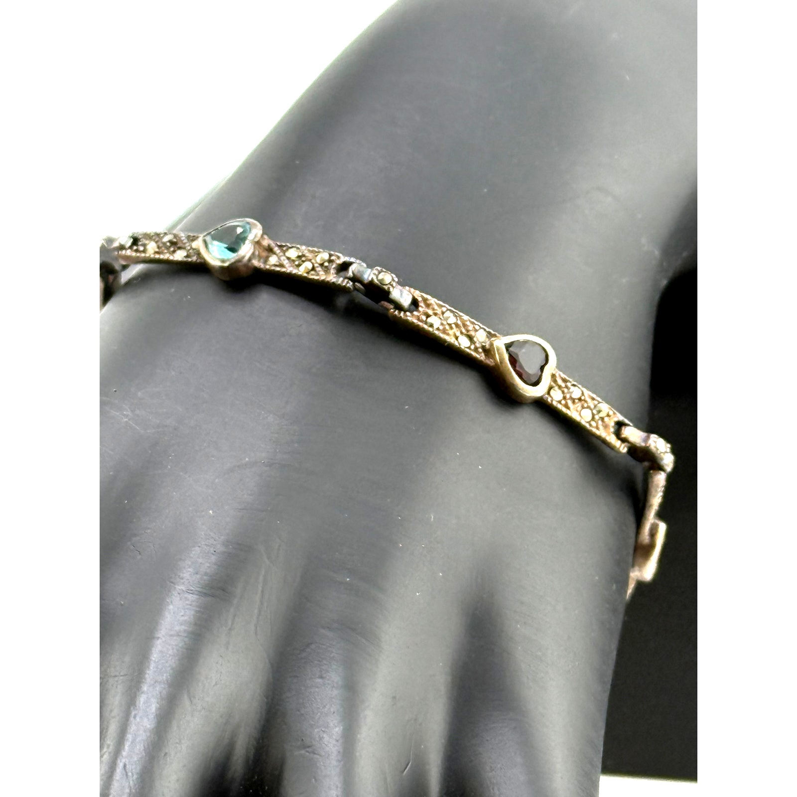 A beautiful sterling silver bracelet with heart shaped tourmaline gems in red, blue, clear and yellow. Measures 7.25 inches. Very pretty and unusual.