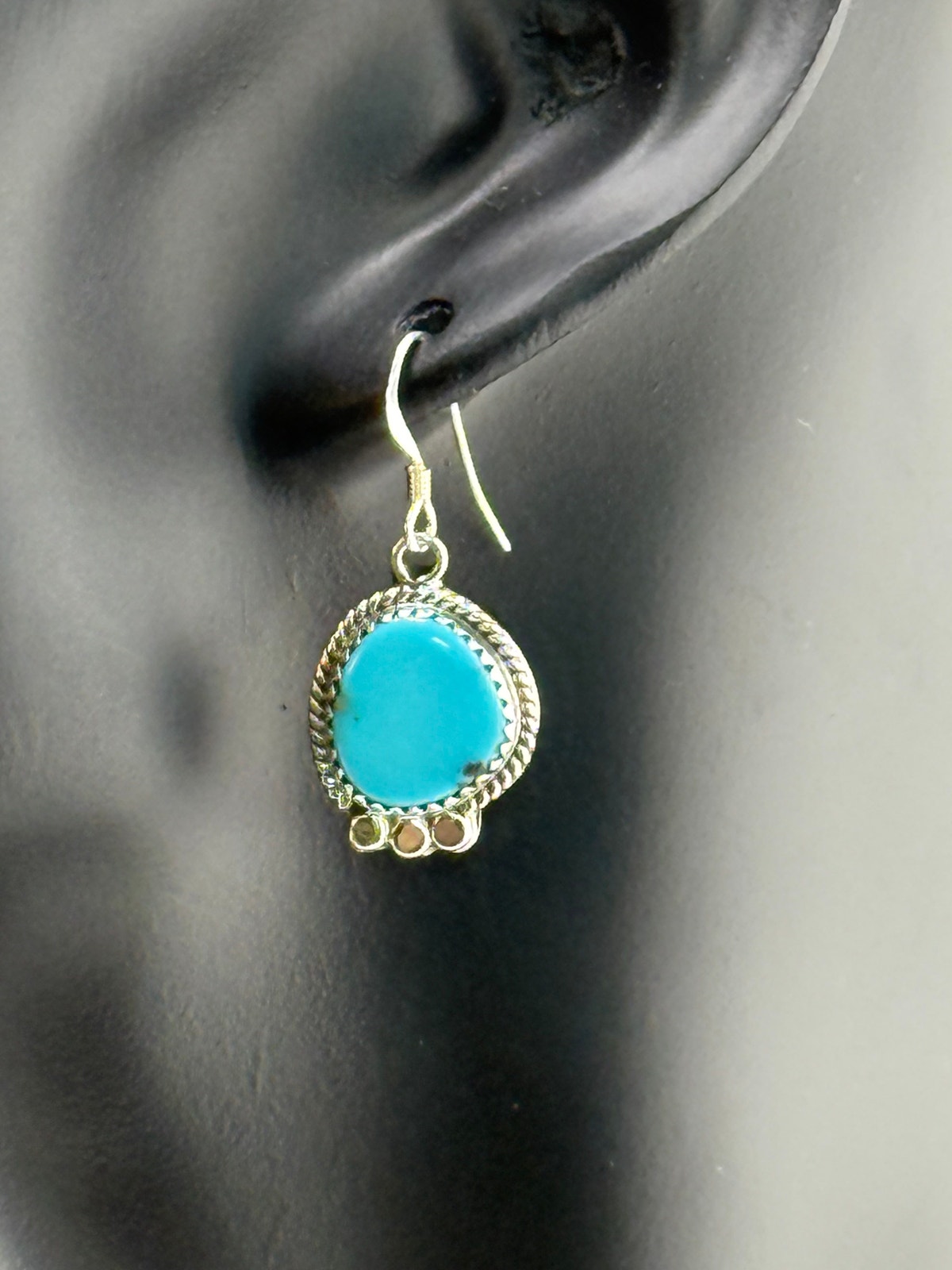 These earrings feature a lovely turquoise gemstone and accented with sterling silver layers. Measure 1.25″ x 0.6″. Unmarked but test as sterling silver and likely Native American.