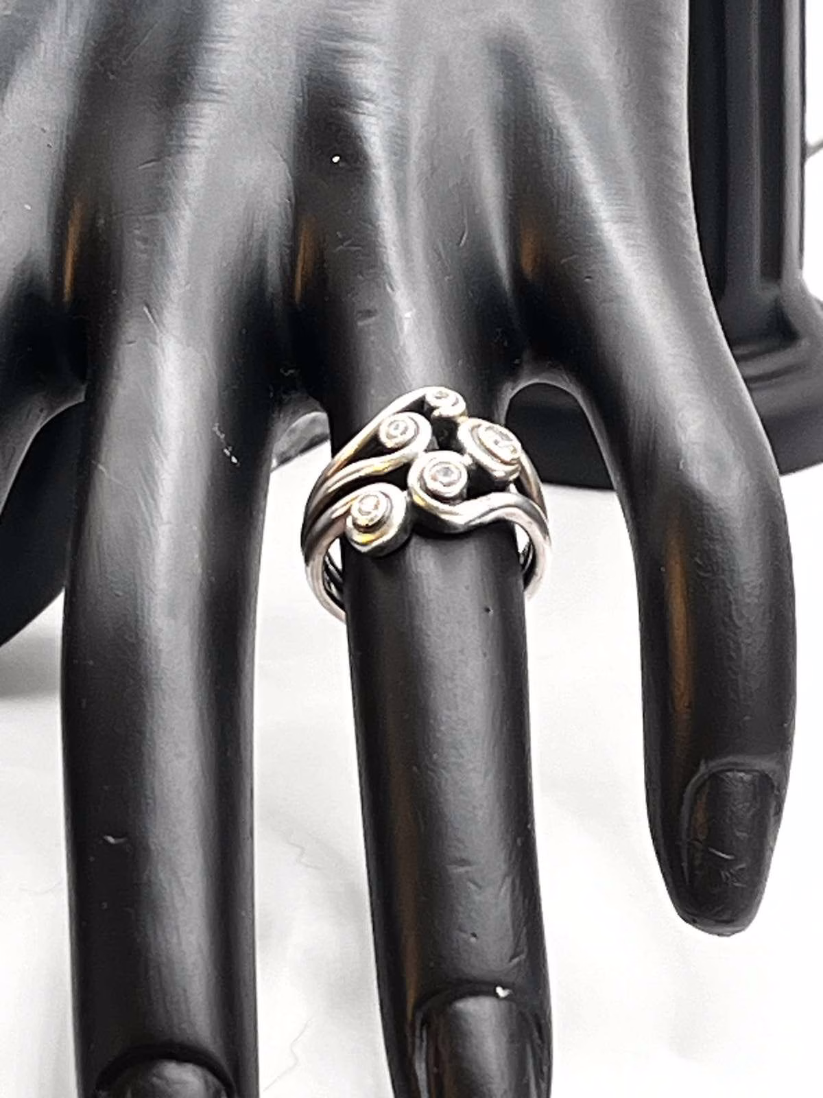 Beautiful CZ’s set in elaborate sterling silver. Measures 0.6 inch long by 0.6 inches wide. Size 5. Gorgeous ring.